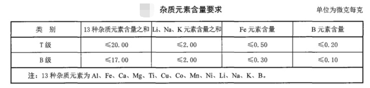 T级石英玻璃管的铝、铁、钙、镁、钛、铜、钴、锰、镍、锂、钠、钾、硼十三种杂质元素的总含量应不大?0.00x10-6,其中:铁含量应不大?.50x10-6,钛含量应不大于3.00x10-6,铜含量应不大于0.80x10-6,硼含量应不大于0.20x10-6,锂、钠、钾总含量应不大?.00x10-6、br/>