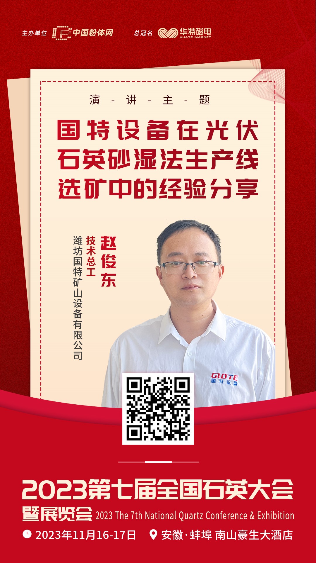 2023?1?6-17日,中国粉体网将于安徽·蚌埠南山豪生大酒店举办?023(第七届)全国石英大会暨展览会”。来自潍坊国特矿山设备有限公司的技术总工赵俊东将作《国特设备在光伏石英砂湿法生产线选矿中的经验分享》报告、/p>