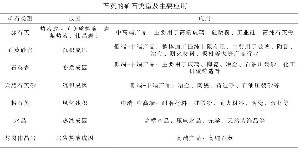 脉石英主要由富硅的岩浆热液或变质热液充填于裂隙中形成,通常脉石英原矿SiO2品位高,可达98%以上,Fe等杂质含量低,矿物组成简单,矿石可加工性强,部分脉石英提纯加工后可以达到高纯石英原料要求,但脉石英硬度大,矿体规模相对较小,因此,脉石英多用作生产高端玻璃、硅微粉、工业硅、高纯石英等高附加值产品的原料、/p>