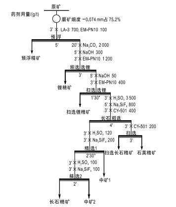 在伟晶岩型锂辉石选矿中,75%的尾矿成分为石英与长石。蒋朋等以川西锂辉石尾矿为对象,采用H2SO4调节pH、Na2SiF6抑制长石、CY-501捕收剂浮选,???精流程获得SiO2品位96.64%的石英精矿,满足平板玻璃及器皿玻璃原料标准、/p>