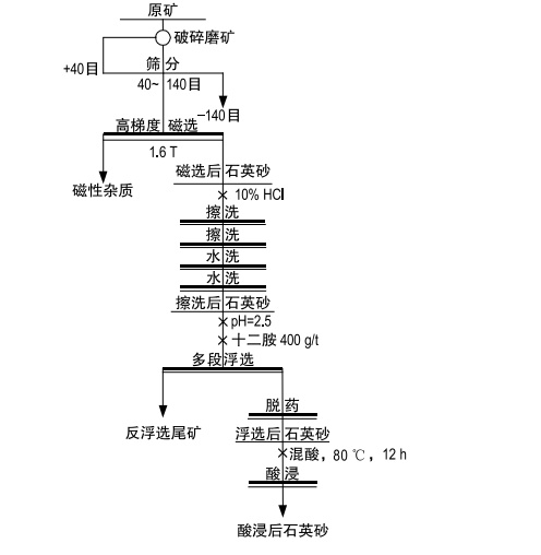 代雷孟等针对广东某高岭土尾矿?.6?mm粒级样品,采用“陶瓷球磨矿—分级?段磁选”物理方法提纯处理,获得的磁选精砂产率为66.1%,SiO2含量?9.65%、Al2O3含量?.12%,Fe2O3含量?.0092%,满足Fe2O3含量小于0.01%的低铁石英砂质量要求。采用“陶瓷球磨矿—分级?段磁选—酸浸”化学方法提纯处理,在HF用量20kg/t,草酸用?0kg/t条件下,酸浸精砂Fe2O3含量0.0071%,可制备满足Fe2O3含量小于0.0080%的低铁石英砂质量要求、/p>