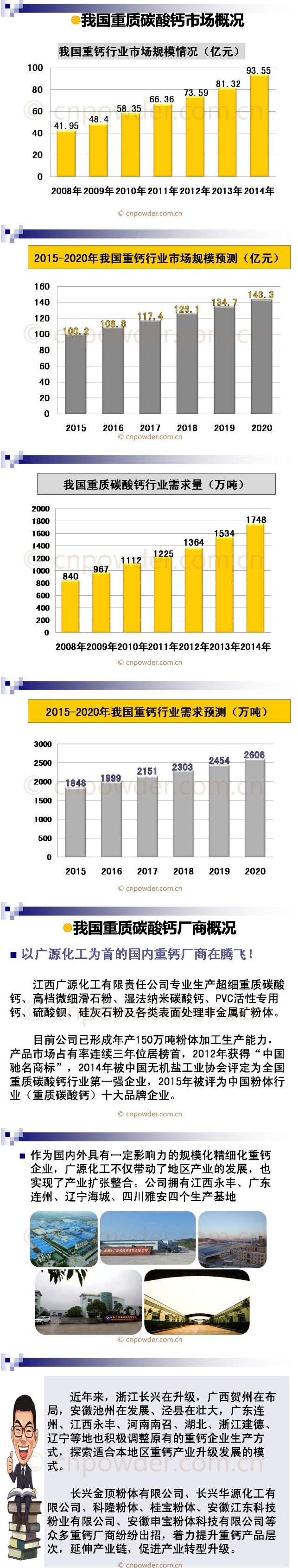 碳酸钙产业被誉为可持续发展的朝阳产业。按“十三五”规划及重钙在我国的发展趋势,预计到2020年我国重质碳酸钙粉行业生产规模达?300万吨、/p>