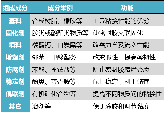 密封胶通常以沥青物、天然树脂或合成树脂、天然橡胶或合成橡胶等干性或非干性的粘稠物为基料,配合碳酸钙、滑石粉、白土、炭黑、钛白粉和石棉等惰性填料,再加入增塑剂、溶剂、固化剂、促进剂等制成、/p>