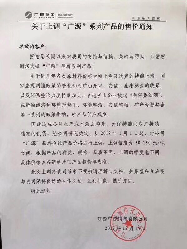 中国粉体网讯2017?2?9日,国内碳酸钙龙头企业广源化工发布通知,经公司研究决定,从2018??日起,对公司“广源”品牌全线产品价格进行上调,上调幅度?0-150 ?吨之间,根据产品的种类、规格、品质不同,上调的幅度也不同,具体价格以各销售片区产品报价单为准、/span>