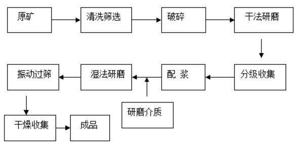 原矿经洗选后两段破碎?00目左右,配制成一定浓度的浆液,加入研磨助剂,给入立式研磨机,以氧化锆珠作为研磨介质,通过调整磨机各项参数控制出料细度,物料经磨细后以浆料形式排出,经干燥除尘后收集装袋、/p>