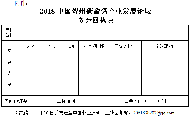中国碳酸钙产业快速发展的同时,也面临着产业集中度低、企业规模小、资源浪费、环境污染、产品单一、技术与装备急需提升等诸多问题与挑战。为了全面贯彻党的十九大精神,落实“创新、协调、绿色、开放、共享”发展理念,进一步推进我国碳酸钙产业供给侧结构性改革,促进碳酸钙产业升级,同时提升贺州碳酸钙产业影响力,提高企业创新意识,促进贺州市碳酸钙产业健康、有序、高质量发展、strong>中国非金属矿工业协会与贺州市人民政府将于2018??6日在广西贺州市共同举办?018中国贺州碳酸钙产业发展论坛”(预计会议规模200人)、/strong>现将会议有关事项通知如下9/p>