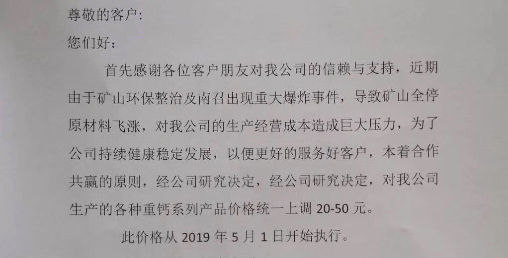中国粉体网讯近日,某碳酸钙企业发文称9span style="line-height: 1.75em; color: rgb(192, 0, 0);">近期由于矿山环保整治及南召出现重大爆炸事件,导致矿山全停原材料飞?/strong>,对公司的生产经营成本造成巨大压力,为了公司持续健康稳定发展,以便更好的服务客户,本着合作共赢的原则,经公司研究决定,对公司生产的各种重钙系列产品价格统一上调20-50元、/span>