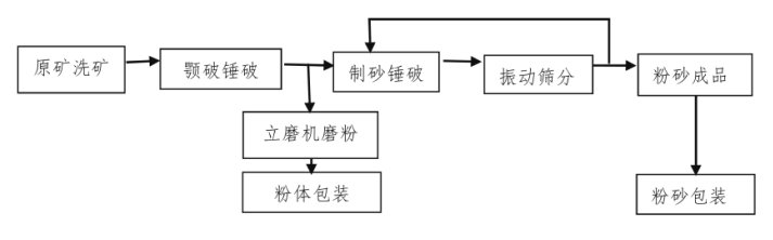 大理石原矿在经汽车运输进厂后,用铲车铲装到振动洗矿机,经过喷淋水管、高压水枪洗矿后进入破碎系统,自动给料机定量向颚式破碎机投料,粗破后的矿石进入高细锤式破碎机细碎生成大约10mm的碎石。再由斗式提升机输送到原料仓顶部的振动筛中进行筛分,合格的小颗粒碎石直接进入原料仓,大颗粒碎石沿斜管溜回破碎机再次破碎、br/>