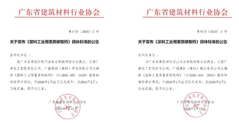 《塑料工业用重质碳酸钙》(T/GBMA 002?020)团体标准、《涂料工业用重质碳酸钙》(T/GBMA 003?020)团体标准均由江西广源化工有限责任公司、广福建材(蕉岭)精化有限公司主编、/p>