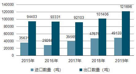 2015-2019年中国碳酸钙进出口数量统讠/p>