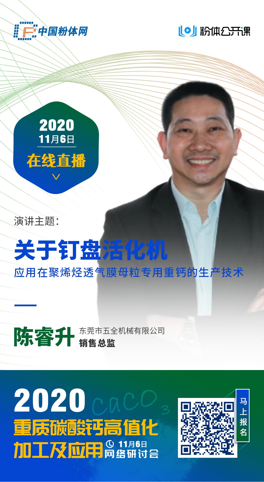 2020?1?日,中国粉体网旗下粉体公开课平台将举办首届“重质碳酸钙高值化加工及应用网络研讨会“/strong>,届时来?span style="color: rgb(192, 0, 0);">东莞市五全机械有限公司的销售总监陈睿卆/strong>将作《关于钉盘活化机应用在聚烯烃透气膜母粒专用重钙的生产技术探讨《/strong>报告,详细讲述聚烯烃透气膜、透气膜重钙粉干法研磨生产工艺、对优质透气膜专用重钙粉的要求以及PE透气膜母粒专用重钙粉参数指标等内容、/p>