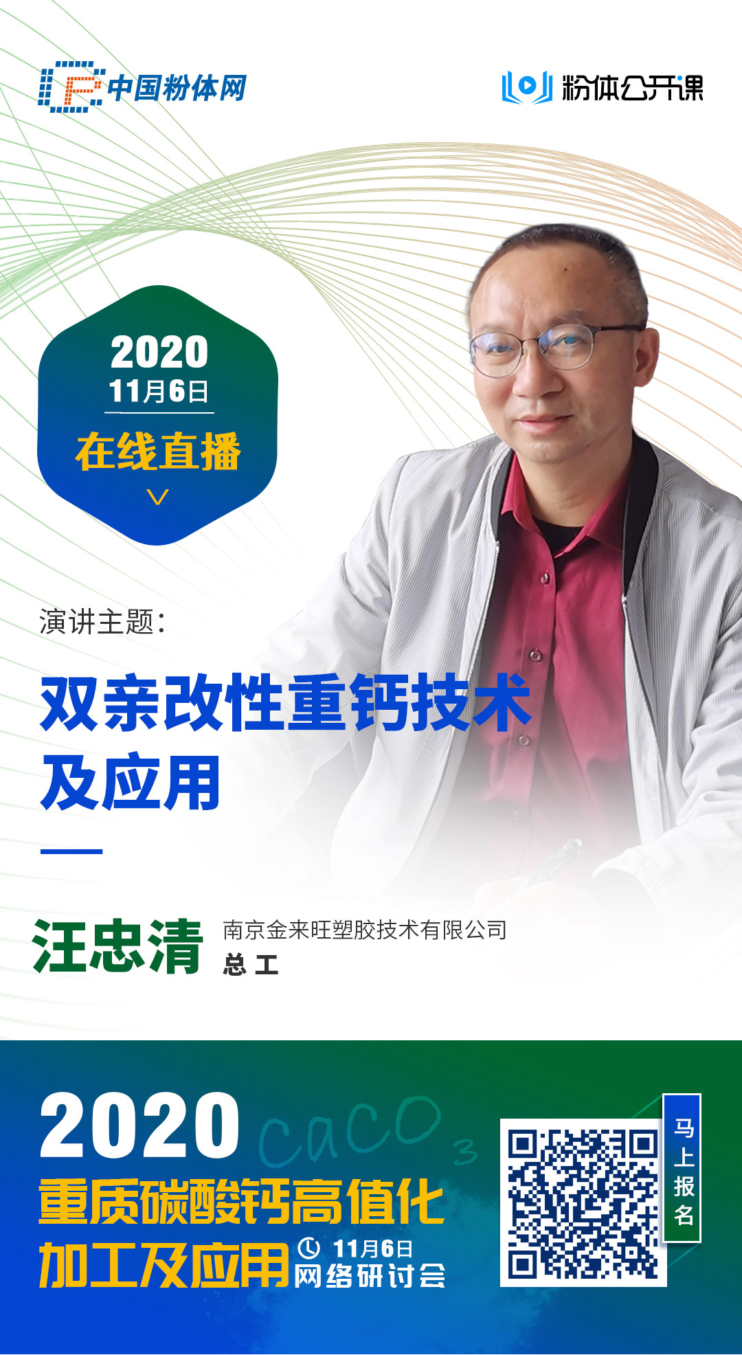 为了引领碳酸钙行业走上创新、绿色、协调的可持续发展道路,中国粉体网旗下粉体公开课平台将亍strong>2020?1?日举办首届?020重质碳酸钙高值化加工及应用网络研讨会”、/strong>平台邀请到了南京工业大学材料学院、南京金来旺塑胶技术有限公司、江苏爱特恩高分子材料有限公司的汪忠清教授做客直播间,分?strong>《双亲改性重钙技术及应用》报呉/strong>。汪忠清老师将从粉体改性技术概况、双亲改性实验方法、双亲改性生产工艺及加工设备选择、改性功能粉性能测试及工业应?/strong>等四个方面具体讲解重钙与双亲改性技术、/p>