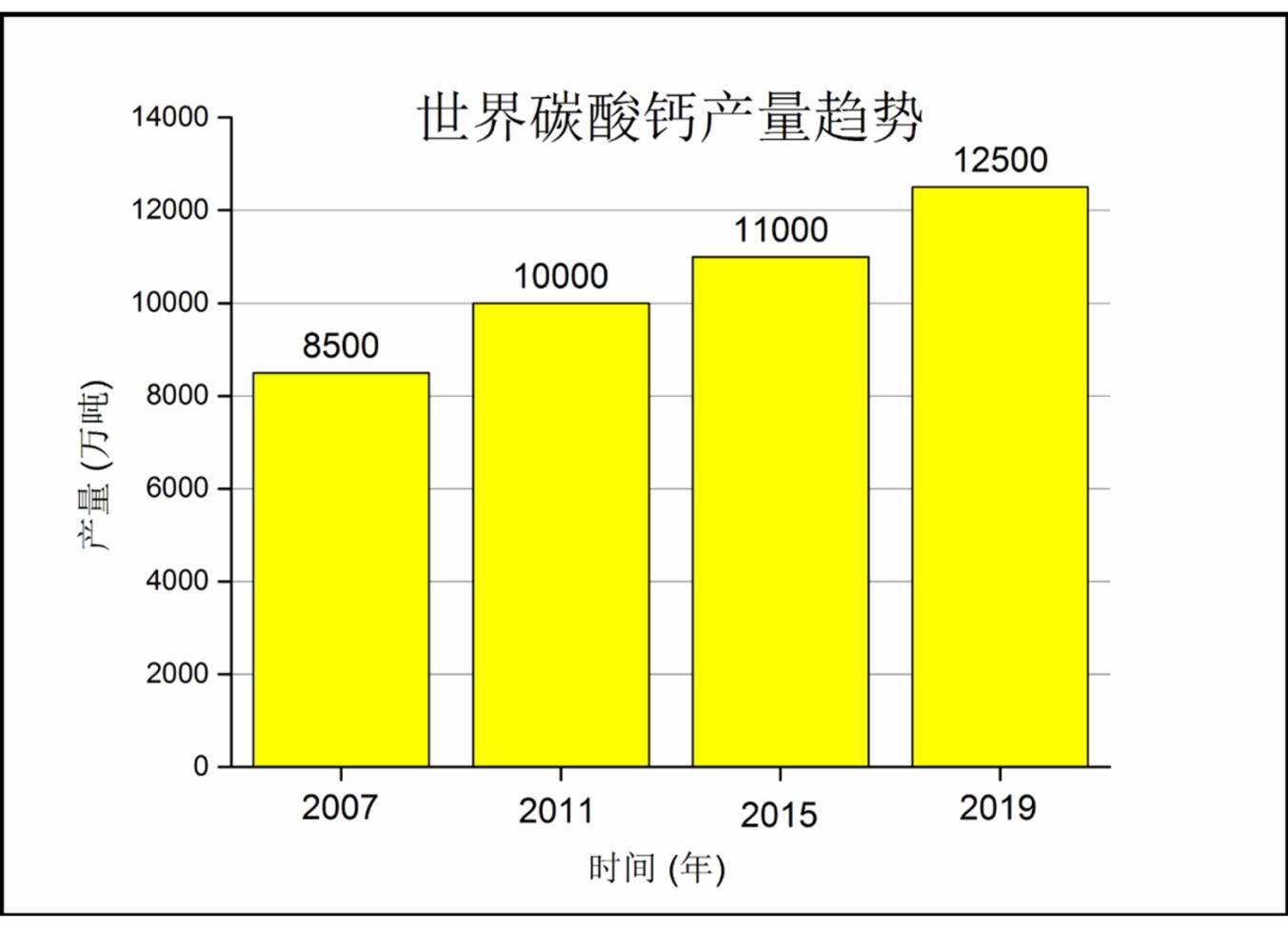 由于造纸、涂料、塑料、橡胶等材料工业的快速发展,市场对重质碳酸钙、轻?纳米)碳酸钙等碳酸钙产品需求量越来越大。世界碳酸钙的生产能力在过去10年以年均增长?%-8%的速度增长。据中国粉体网统计,2011年,世界碳酸钙产量约1亿t,其中重质碳酸钙超过800万t,轻质碳酸钙超过1700万t;2015年世界碳酸钙产量?.1亿t,其中重质碳酸钙可达9000万t,而中国重质碳酸钙约为1500万t;2019年全球碳酸钙产量达到1.2亿以上、/p>