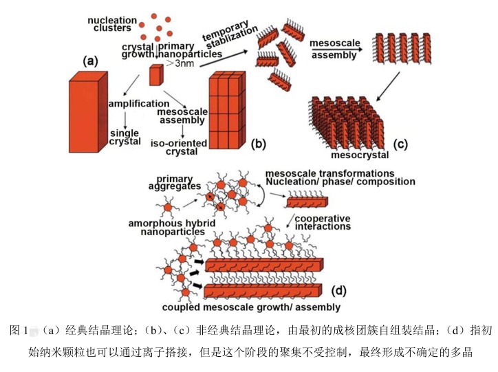 经典结晶理论认为,在结晶初期首先形成一些临界晶核团簇,即初始的纳米粒子,这些纳米粒子作为结晶的最小单元,晶体通过离子-离子搭接的方式逐渐长大、/span>