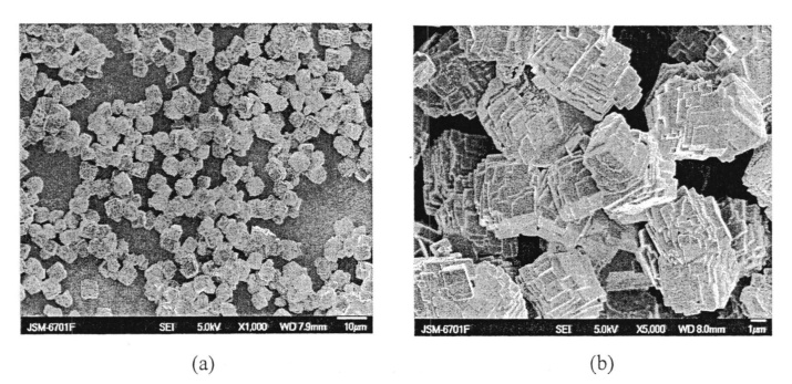 从图像可以看出,以乙二酸为晶型控制剂,碳酸钙颗粒粒径大小均匀,平均粒径在10pum左右,分散性好,颗粒表面曲折多边,错落凹凸,表面粗糙,形貌为类立方体形状、/span>