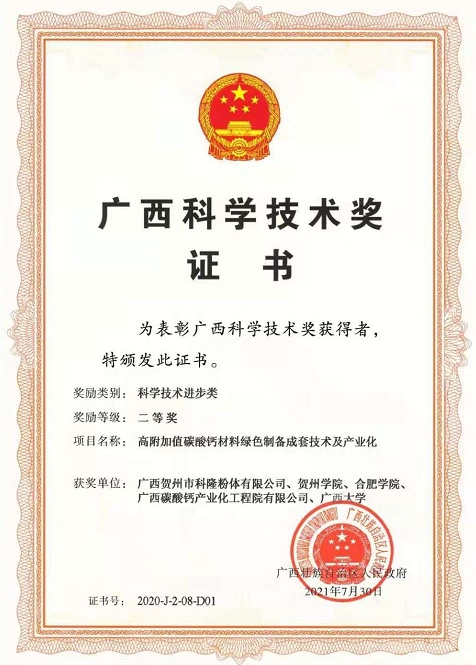 2021??0日,广西科学技术奖励大会在邕举行。由科隆公司牵头,贺州学院、合肥学院、广西碳酸钙产业化工程院、广西大学五家单位联合申报的项目《高附加值碳酸钙材料绿色制备成套技术及产业化》获?020年度广西科技进步二等奖、/span>