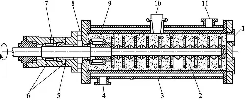 该型搅拌磨上部给料,中下部排料;上部设有进浆口、分散剂添加口和排气口;下部侧壁设有浆料出口和研磨介质排出口。筒体内部做成多角形(六边形或八边?,增加了颗粒被研磨的概率和研磨强度。由于浆料停留时间较短,一方面物料不容易过磨;另一方面,研磨过程温升较小,不容易出现黏胀,因而研磨效率较高。这种磨机近几年在重质碳酸钙浆料和超细煅烧高岭土生产中得到了越来越多的应?sup>[5]、/span>
