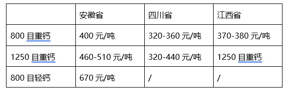 800目重钙约320-360?吨,1250目重钙约320-440??/span>