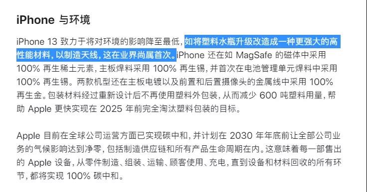 近日,一条来自苹果官方的信息“在iPhone13中,天线是回收的塑料水瓶制造的!”突然引发网友热议。据苹果官方的回应,由于致力于环保,他们将塑料水瓶升级改造成一种更强大的高性能材料,以制造天线、/span>