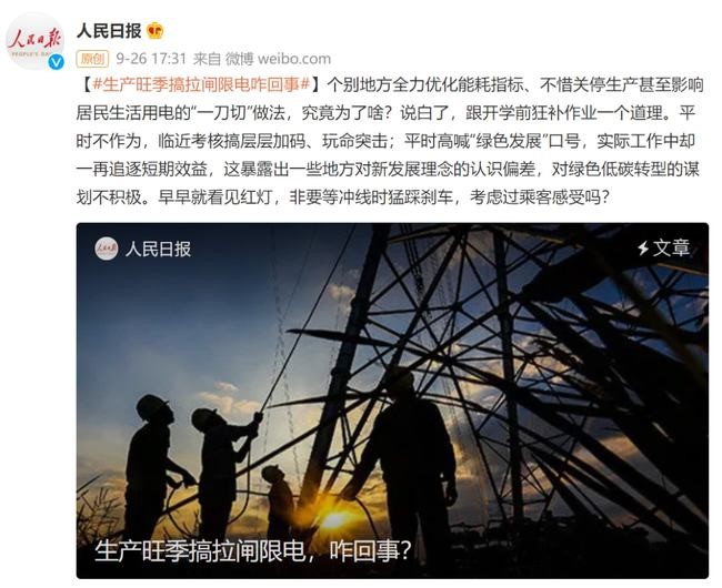 人民网点评,限电问题与大宗商品价格的上涨有关,特别是煤炭价格的疯涨。此外,一些省份并未完成“能耗双控”要求,压力之下,便急踩刹车,选择限电。东北地区已经首先对非居民执行了有序用电,但是在执行后仍存在电力缺口,又采取了对居民限电的措施、/span>