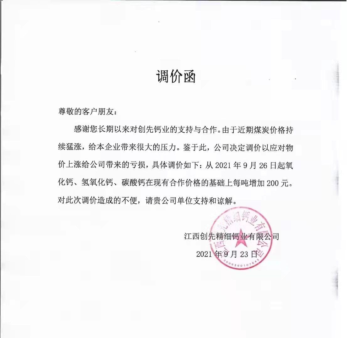 受煤炭价格上涨影 江西创先钙业产品价格上调