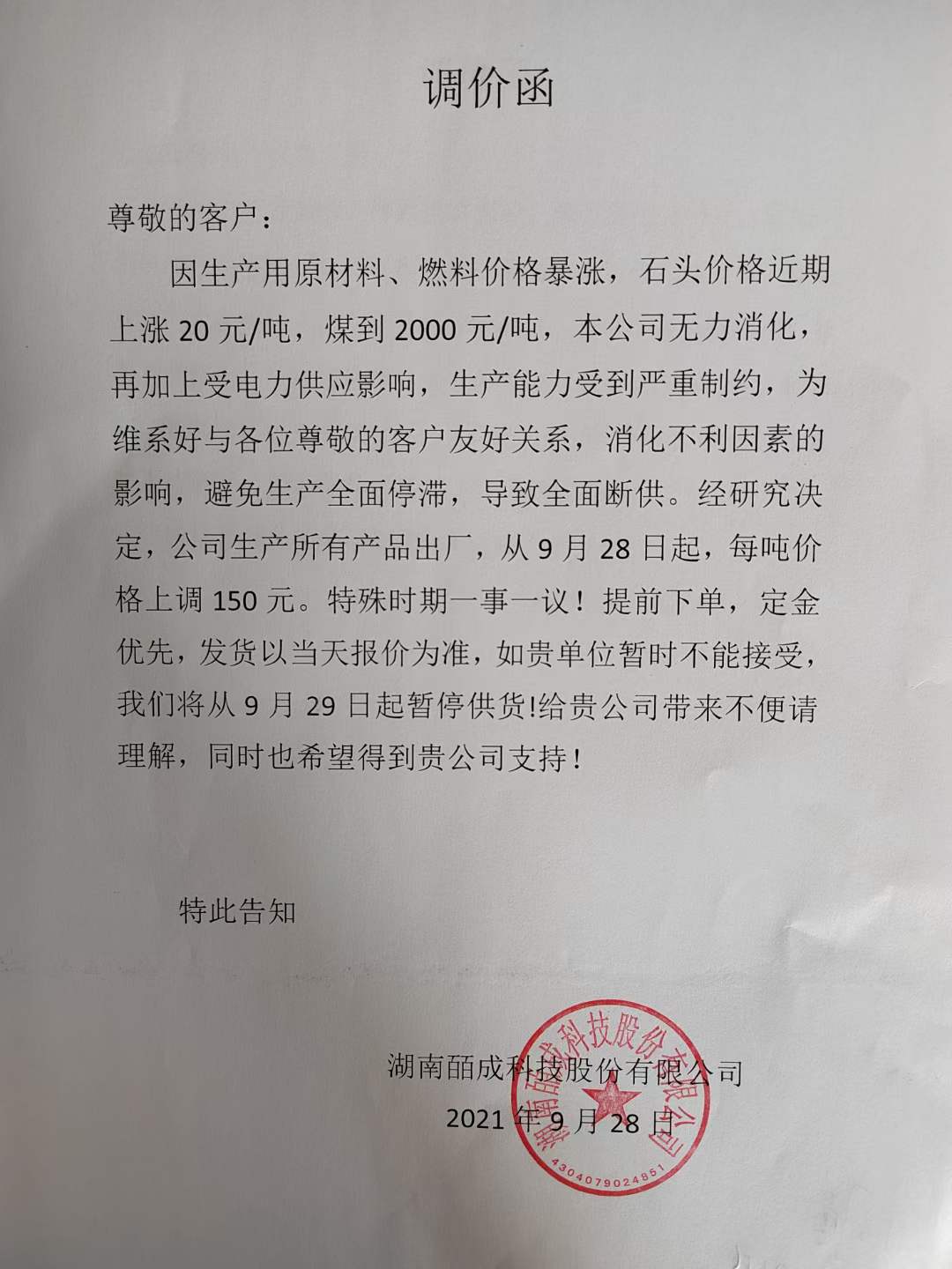 就碳酸钙企业而言+/span>全国各大碳酸钙产业基地以及大小企业都不同程度受拉闸限电影响,而且越来越糟。辽宁、山东、河南、安徽、浙江、江西、广东等多地碳酸钙企业多有停产现象、strong>9?5~28号几天时间,在朋友圈随手可以刷到许多碳酸钙延迟发货和涨价的通知函。有些碳酸钙企业生产很“坎坷”,刚刚挺住?开2,又来了一个停5开1;有些企业刚刚挺住原材料涨价,拿到一点货就遇上错峰生产,拉闸限电...