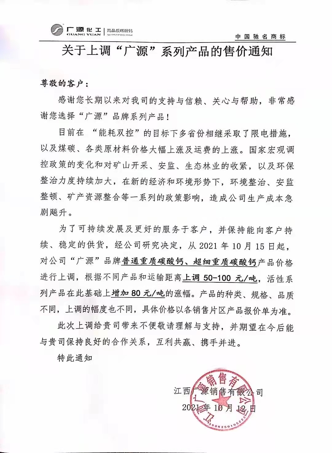 受限电煤炭各类原材料大幅上涨以及运费成本提高,从2021?0?5日起江西广源品牌普通重质碳酸钙、超细重质碳酸钙产品价格上调50-100?吨,活化系列产品在基础上上?0?吨涨幅!