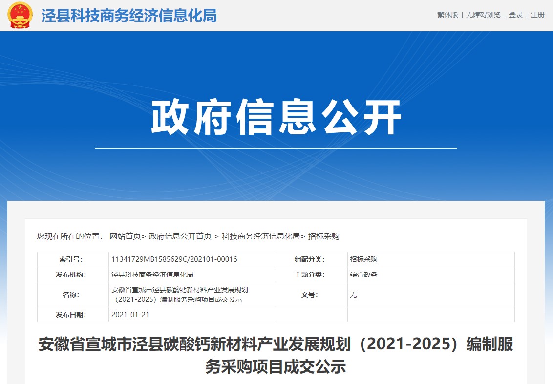 2021??1日,据泾县科技商务经济信息化局公示,安徽省宣城市泾县碳酸钙新材料产业发展规?2021-2025)编制服务采购项目成交?021??0日,安徽省宣城市泾县碳酸钙新材料产业发展规划(2021-2025)专家评审会在泾县召开,一致同意通过《规划》评审,并建议尽快安排规划方案的落地实施、/span>