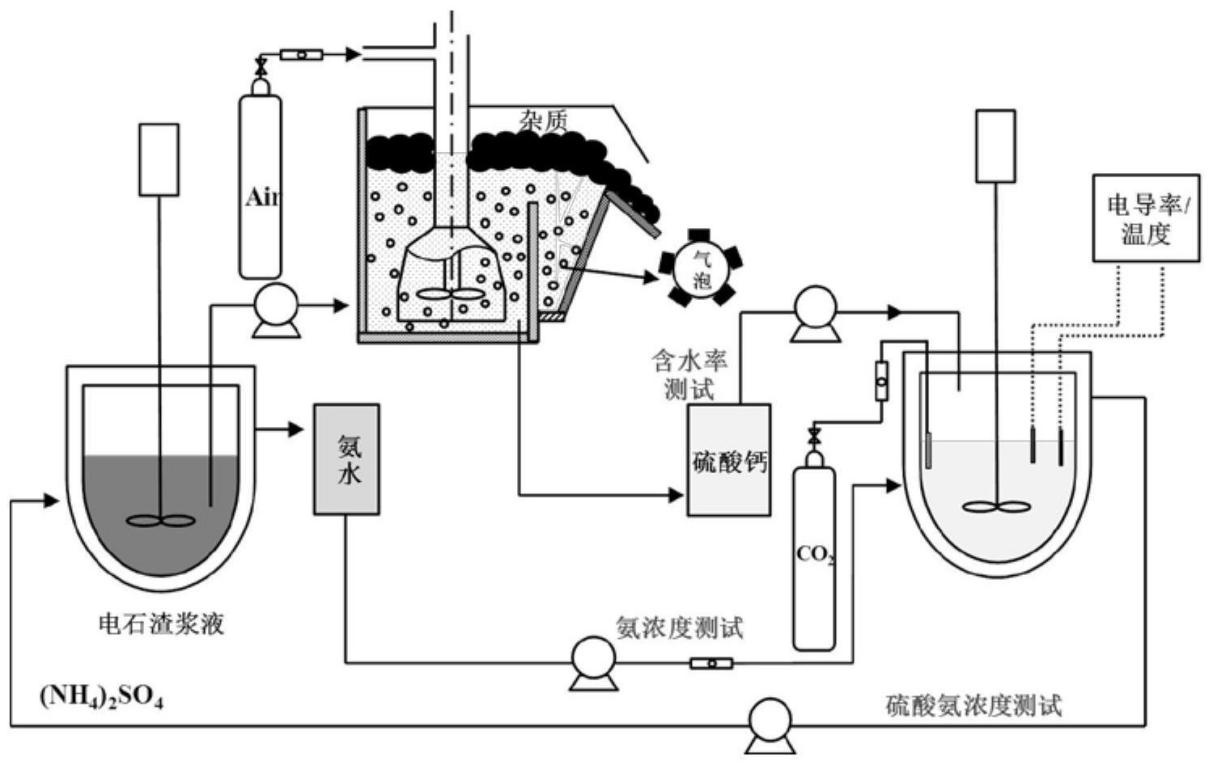 摘要:本发明公开了一种CO2矿化电石渣制备纳米球霰石碳酸钙方法:电石渣中钙组分的浸取:将电石渣与硫酸铵溶液混合,搅拌反应过滤得到含钙中间产物和滤液;含钙中间产物浮选除杂:将含钙中间产物加水和混合后添加浮选剂进行浮选,浮选后的含钙产物经过滤得到固相二水硫酸钙;碳化反应:将二水硫酸钙加水充分搅拌混合得到含钙浆体,将滤液加入含钙浆体中并同时通入CO2气体碳化得到碳酸钙产物,再加入分散剂继续搅拌后继续通气终止碳化反应,进行固液相分离得到纳米球霰石型碳酸钙。该方法以硫酸铵作为电石渣浸取剂通过分步式温和矿化工艺来获取纳米球霰石碳酸钙的方法,可以得到纯度及白度较高的纳米球霰石型碳酸钙、/p>