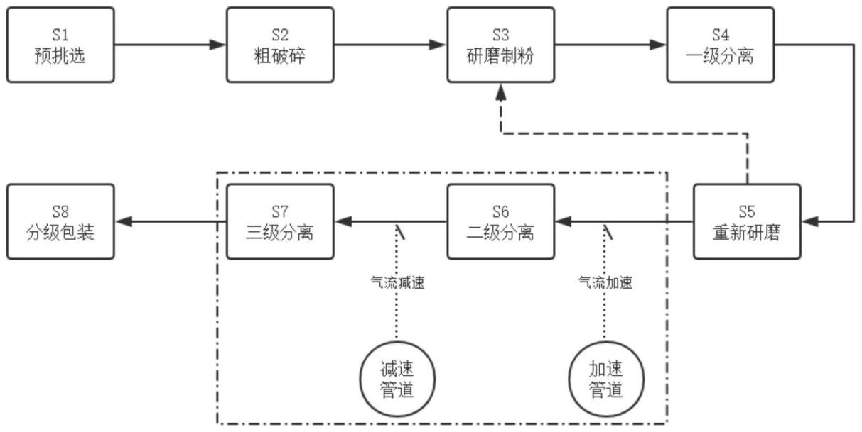 摘要:本发明公开了一种多级分离自控速式重质碳酸钙的制备工艺,属于碳酸钙制备领域,一种多级分离自控速式重质碳酸钙的制备工艺,包括如下步骤:预挑选;粗破碎;研磨制粉;一级分离;重新研磨;二级分离;三级分离;分级包装,可以通过在进行相对应级别分离前,通过加速管道和减速管道对气流的速度进行调节,有效保证重质碳酸钙分离的效果,对分离设备进行保护,进而使得重质碳酸钙能够正常制备,提高制备质量,并且能够有效省去后续分离过程增气提速的步骤,在减少外部气流对分离设备内部气流进行冲击和影响的同时,有效节省压缩机的投入和能量损耗,降低重质碳酸钙的制备成本,提高其的经济效益、/p>