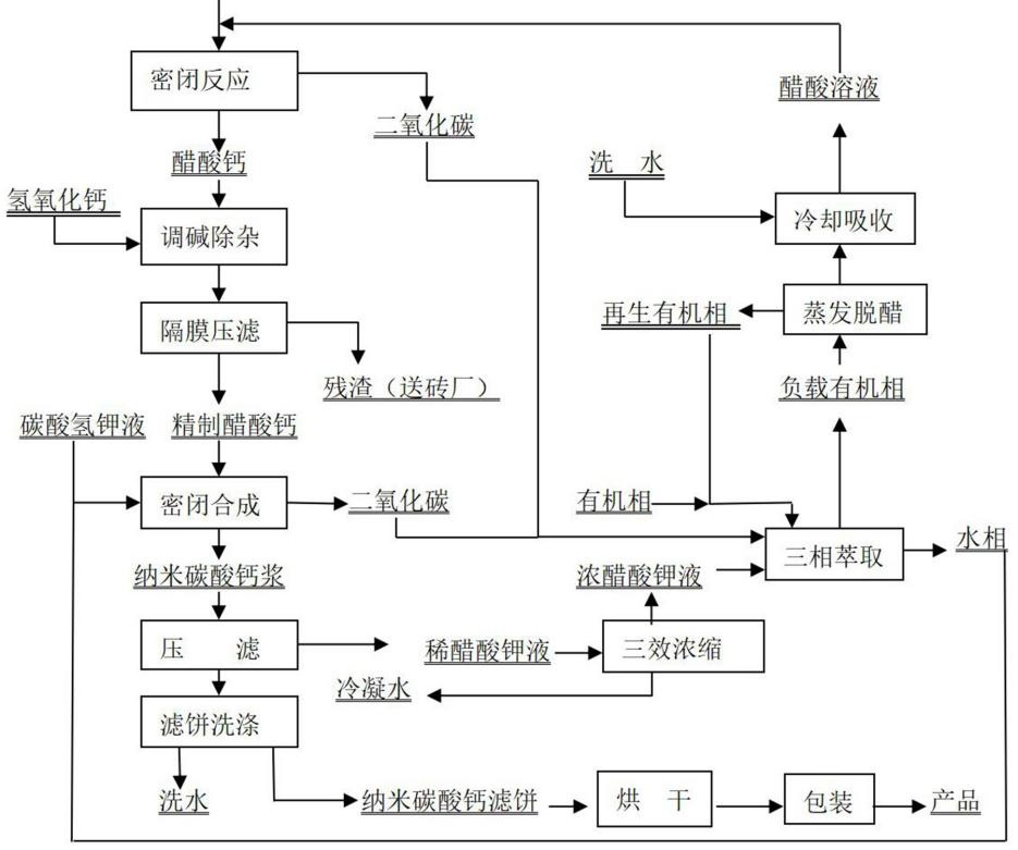 摘要:本发明涉及无机合成技术领域,公开一种循环制备纳米碳酸钙的工艺方法,本方法采用石灰石为原料,醋酸溶液为溶剂,两者反应制备醋酸钙溶液和二氧化碳气体,制得的醋酸钙溶液与碳酸氢钾溶液合成纳米碳酸钙,液固分离后的溶液为醋酸钾溶液,该溶液在通入二氧化碳的情况下用高沸点有机胺配制的有机相进行萃取醋酸,萃余液即是碳酸氢钾溶液,经浓缩后用于合成,有机相通过负压蒸发获得醋酸溶液并使有机相再生;本发明除了消耗石灰石外,其他物质基本上都是循环使用,消耗极少,浓缩碳酸氢钾和蒸发醋酸的能耗相对传统的合成法也大大减少,所以本方法实现了在低能耗、低消耗的生产条件下生产纳米碳酸钙,同时原料成本低、整体工艺成本也低,实现了绿色环保地生产纳米碳酸钙、/p>