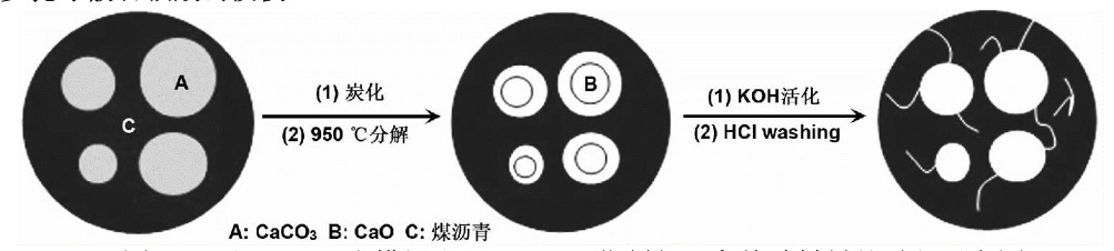 CaCO3为模板和 KOH 活化制备沥青基碳材料的过程示意图