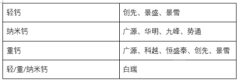 专利申请方面,数量上广源化工累计40+,九峰纳米累?0+,华明纳米累?0+,科越科技累计30+,势通钙业累?0+,白瑞碳酸钙累计10,创先精品钙业累?0(氧化?氢氧化钙)。特点上广源化工着重改性工艺和专用型碳酸钙制备技术,势通钙业着重纳米钙碳化工艺优化,九峰纳米着重碳化装置和工艺优化,华明纳米着重油墨等专用型纳米钙制备、改性以及碳化装置优化,科越科技着重生产设备、装置的优化,重视改性工艺,白瑞着重轻钙生产辅助装置,有造纸用碳酸钙生产系统、/p>