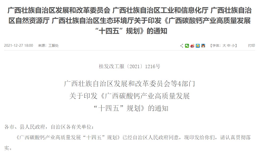 中国粉体网讯2021?2月,广西壮族自治区发展和改革委员会、工业和信息化厅、自然资源厅、生态环境厅4部门联合印发亅span style="color:red">《广西碳酸钙产业高质量发展“十四五”规划《/span>(桂发改工服[2021]1216?。碳酸钙产业是广西重点培育的千亿元产业,推进碳酸钙产业高质量发展,对于积极承接东部产业转移、实现优势资源集约节约利用和绿色发展具有重大意义、/span>