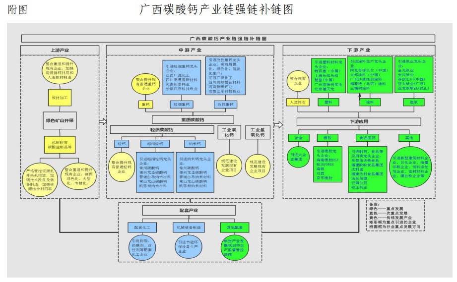 来宾市、/span>重点发展?strong>轻质碳酸钙为为/span>的来宾市碳酸钙产业,进一步优化“一中心五园区”产业布局,加快建讽strong>“桂中物流园+钙基新材料生产交易中心“/strong>。主动承接大湾区产业转移,建讽span style="color:red">功能性粉体、健康无机涂料、高分子材料、高端绿色建材、绿色家居整裄/span>五大产业链。打造集绿色矿山开采与精深加工产品研发、生产、应用、物流于一体的碳酸钙精深加工生态产业体系、/p>