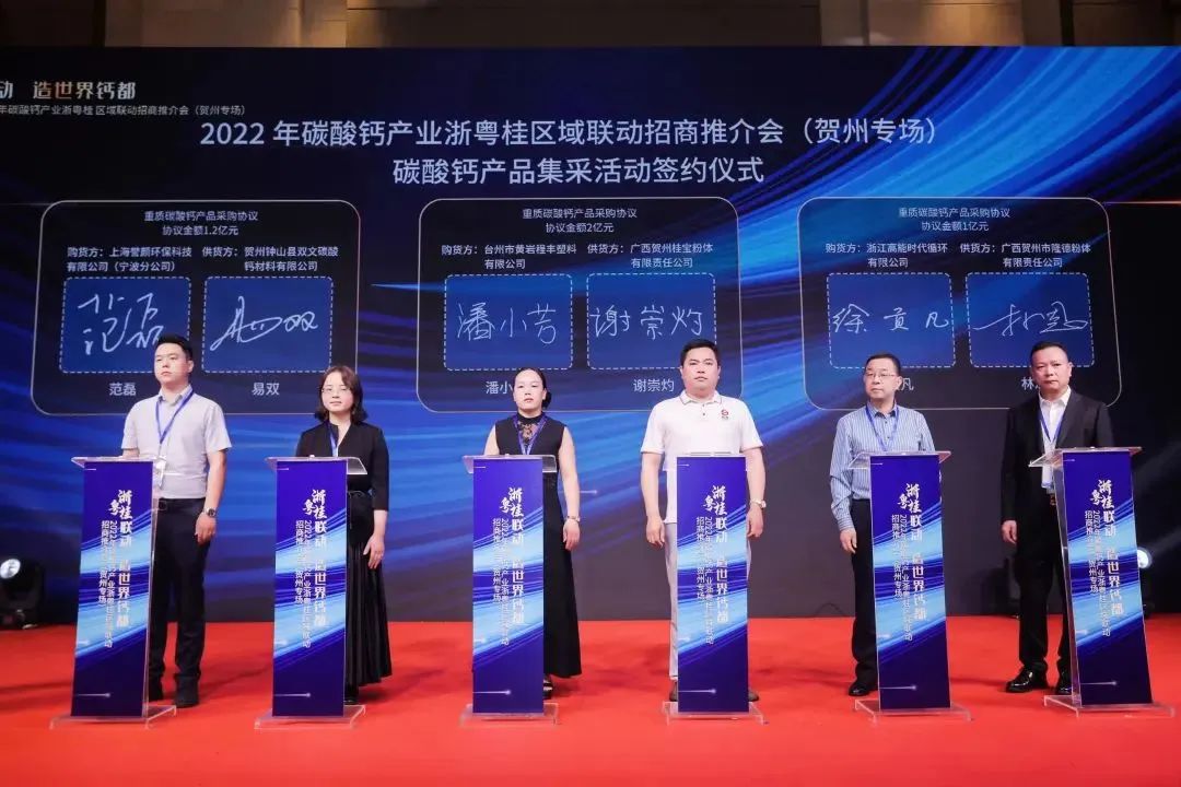 推介会上,贺州市副市长匡永红代表市人民政府与企业代表进行签约。本次签约项目共13个,签约投资总额?02.96亿元。现场举行了碳酸钙产品集采签约活动,集采协议金额?9.2亿元,其中协会执行会长单位广西贺州市科隆粉体有限公司重质碳酸钙产品采购协议金?亿元,副会长单位贺州钟山县双文碳酸钙新材料有限公司重质碳酸钙产品采购协议金额1.2亿元、/p>