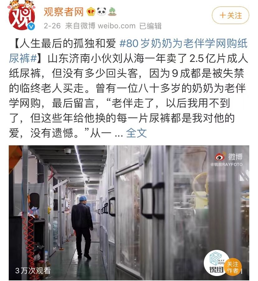2020年有一则新闻,山东济南有个小伙子,一年卖出了2.5亿片成人纸尿裤。这些纸尿裤几乎没有回头客,因为?成都是被失禁的临终老人买走的。有一位八十多岁的奶奶,为了老伴,学会了网购。最后,她给店家留言:“老伴走了,我以后也用不到了,但这些年给他换的纸尿裤,都是我对他的爱,没有遗憾了。“/span>