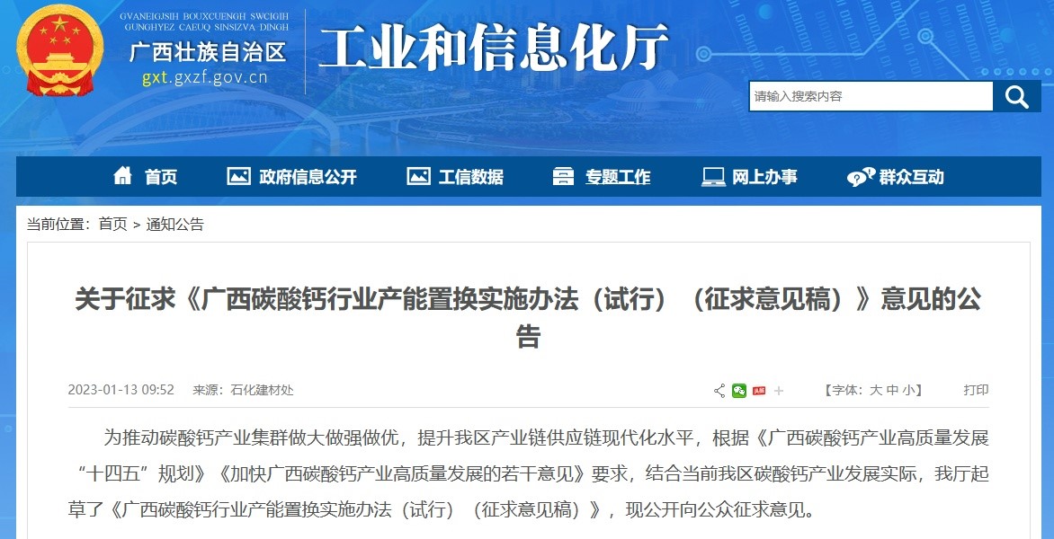 日前,广西工信厅发布《广西碳酸钙行业产能置换实施办法(试行)(征求意见?》,明确提出,严禁备案和建设扩大产能的碳酸钙粉体加工项目,确有必要建设的,必须制定产能置换方案,实施产能置换、/p>