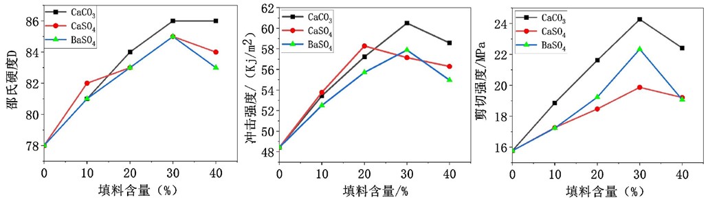 洪树达等研究了碳酸钙/硫酸?硫酸钡三种不同填料对聚氨?环氧树脂胶粘剂(PU/EP)性能的影响,通过不同填料及其含量的材料性能对比发现在填料含量为30%时,PU/EP体系的不同填料都有最佳的力学性能。这是因为填料的添加是有上限的,适当的添加使得填料可以均匀的在分子链之间的空隙充填,过量时则会破换分子链结构、/p>