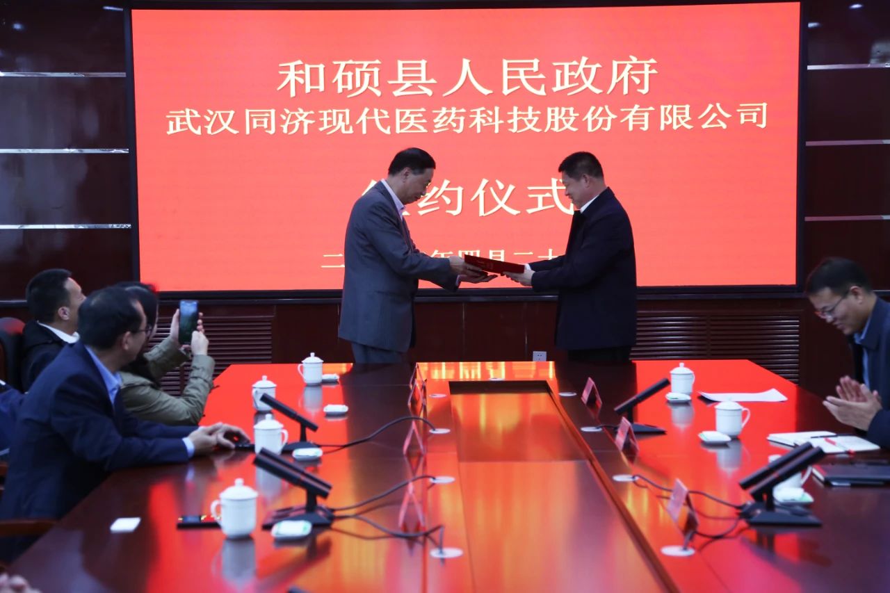和硕县委书记朱军,原中国无机盐工业协会碳酸钙行业分会会长、专家组组长刘树文,武汉同济现代医药有限公司董事长李亦武见证签约并讲话。和硕县委副书记、常务副县长朱宏伟与武汉同济现代医药有限公司董事长李亦武签订战略合作意向书、/p>