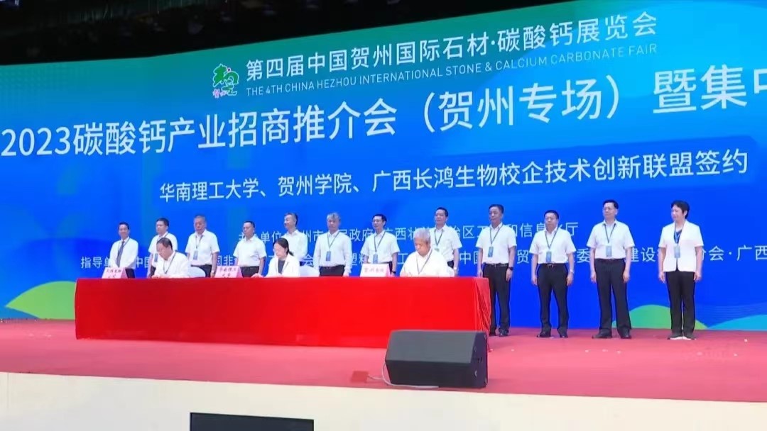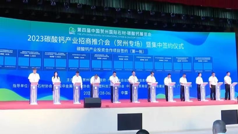 中国粉体网讯6?8日,第四届中?贺州)国际石材·碳酸钙展览会隆重开幕,来自墨西哥、缅甸、柬埔寨等国家及国内多个省(市)?92家企业参展。共签约碳酸钙产业投资合作项?9个,总投?25亿元,其中签约碳酸钙产品集采项目?2个,总采购额38亿元、/span>