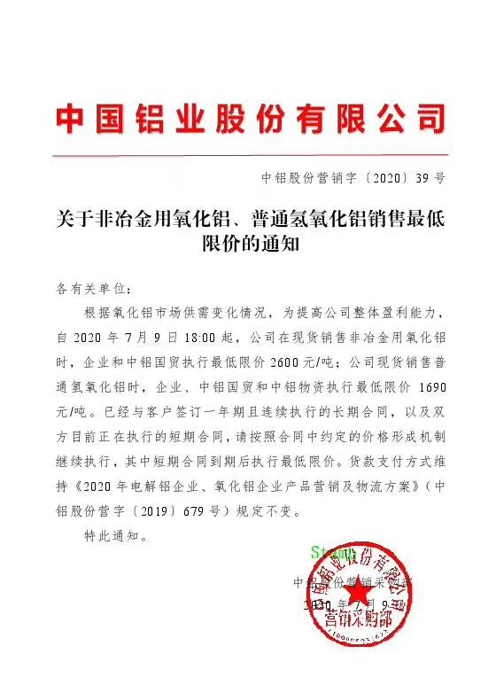 中国粉体网讯近日,中国铝业股份有限公司发布通知称,根据氧化铝市场供需变化情况,为提高公司整体盈利能力,自2020???8:00起,公司在现货销售非冶金用氧化铝时,企业和中铝国贸执行最低限?600??;公司现货销售普通氢氧化铝时,企业、中铝国贸和中铝物资执行最低限?690?吨。已经与客户签订一年期且连续执行的长期合同,以及双方目前正在执行的短期合同,请按照合同中约定的价格形成机制继续执行,其中短期合同到期后执行最低限价。货款支付方式维 ?020年电解铝企业、氧化铝企业产品营销及物流方 (中铝股份营字(2019)679号)规定不变、br/>