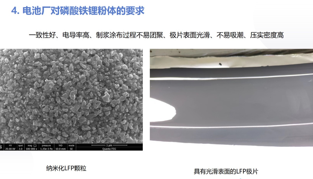 梁广川围绕磷酸铁锂粉体材料的特性及加工性能问题,从磷酸铁锂的粉体特征、磷酸铁锂前驱体的混料加工、磷酸铁锂材料的粉碎加工、电池厂对磷酸铁锂粉体的要求四个方面进行了讲解。磷酸铁锂材料是橄榄石晶体结构,最常用的合成方法是水热法和固相法。梁广川在报告中讲解了液相法、固相法合成的磷酸铁锂,以及磷酸铁锂粉体的常见特征参数。对于磷酸铁锂前驱体的混料加工,他介绍了固相法的生产工艺以及粉体工程的控制因素。在磷酸铁锂的粉碎加工方面,他分别就气流粉碎机结构、烧结工艺控制、粉碎工艺控制以及磷酸铁锂粉碎的要求进行讲解。最后,他介绍了电池厂对磷酸铁锂粉体的要求,包括一致性好、导电率高、制浆涂布过程不易团聚、极片表面光滑、不易吸潮、压实密度高、/p>