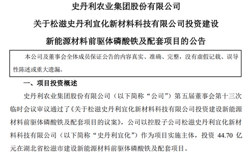 证券时报e公司:磷化工企业争相布局新能 史丹利拟44.7亿元建磷酸铁项目
