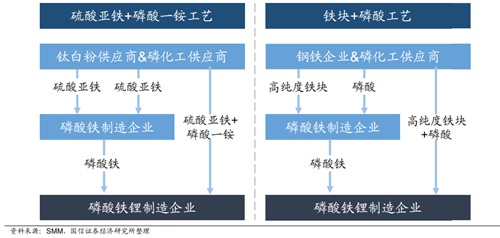 目前工业化生产磷酸铁的方式主要有两种:(1)使用净化磷酸(可热法或湿法)与高纯度铁块反应制备磷酸铁;(2)使用磷酸盐与硫酸亚铁反应制备磷酸铁,常用磷酸盐主要为磷酸一铵(磷酸二氢铵)和磷酸二铵(磷酸氢二铵),主流磷酸盐为磷酸一铵。归类为“铁?磷酸”、“硫酸亚?磷酸一铵”工艺、/p>