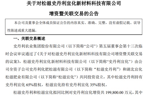 6?9日晚间,史丹利还发布了一则公告,松滋史丹利和松滋宜化拟同比例对史丹利宜化增资?9.98亿元。公司表示,本次增资有利于实现公司磷化工产业链布局发展战略的落地,增资完成后双方将全力推进项目建设、/p>