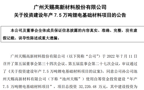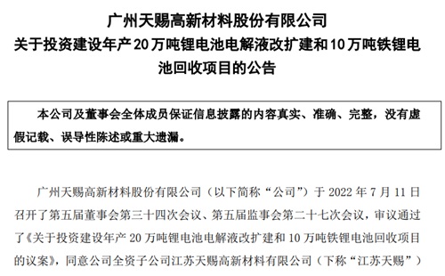 中国粉体网讯7?2日,天赐材料连发两公告,发布关于投资建设新项目:年产20万吨锂电池电解液改扩建和10万吨铁锂电池回收项目,年?.5万吨锂电基础材料项目、/p>