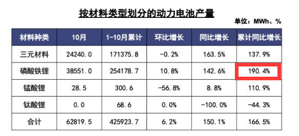 1-10月,我国动力电池累计产量425.9GWh,累计同比增?66.5%。其中三元电池累计产?71.4GWh,占总产?0.2%,累计同比增?37.9%;磷酸铁锂电池累计产?54.2GWh,占总产?9.7%,累计同比增?90.4%、br/>