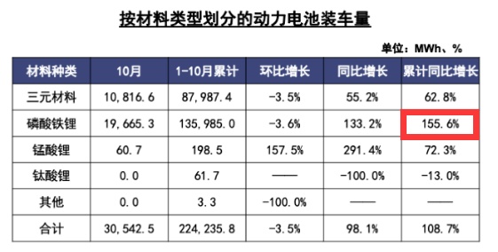 1-10月,我国动力电池累计装车?24.2GWh 累计同比增长108.7%。其中三元电池累计装车量88.0GWh,占总装车量39.2%,累计同比增?2.8%;磷酸铁锂电池累计装车量136.0GWh,占总装车量60.6%,累计同比增?55.6%,呈现快速增长发展势头、br/>