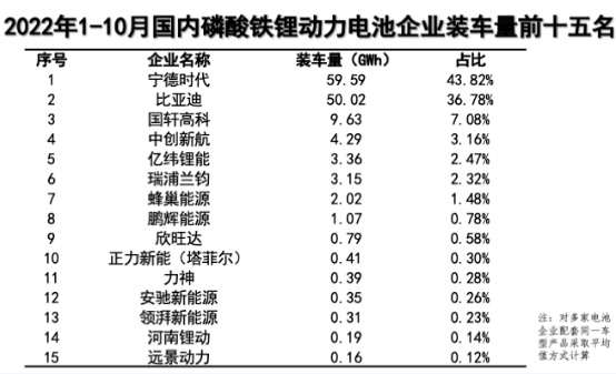 1-10月磷酸铁锂动力电池企业装车量TOP15如下9br/>